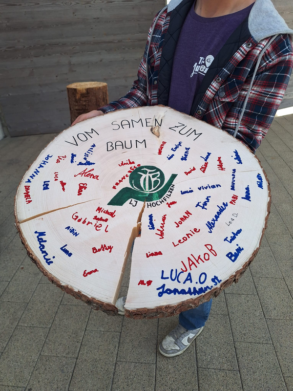 Das Ziel, Volksschulkindern die Entwicklung eines Baumes auf einfache und verständliche Weise näherzubringen, wurde durch die große Freude und den sichtbaren Spaß der Kinder deutlich bestätigt. Die Kinder konnten nachvollziehen, wie aus einem kleinen Samen nach und nach ein Baum entsteht und welche wichtigen Schritte notwendig sind bis zum fertigen Produkt. Als Erinnerung an diesen spannenden Vormittag durfte jedes Kind auf einer großen Baumscheibe unterschreiben, die anschließend in der Volksschule ihren Platz eingenommen hat.