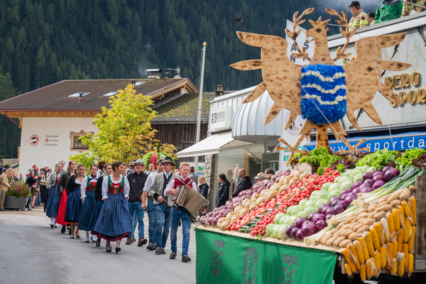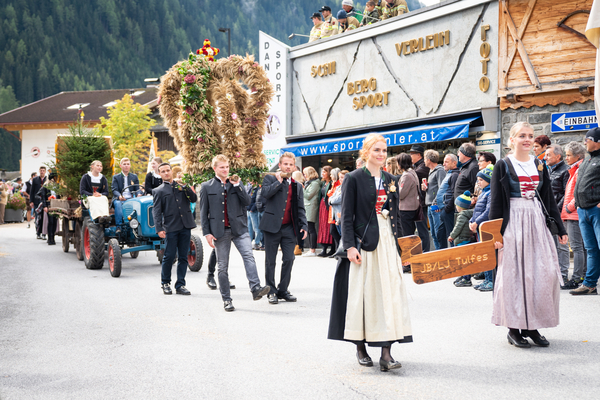 Bei verschneiten Berggipfeln fand am Sonntag, dem 18. September, das Bezirkserntedankfest „Gott zur Ähre" der JB/LJ Bezirk Innsbruck Stadt-Land in Neustift statt. Die Heilige Messe wurde als Feldmesse neben dem Alpenhotel Fernau abgehalten, während dutzende Festwägen und Traktoren schon in den Startlöchern für den Umzug standen. Nach dem traditionellen Fahnenschwingen war es dann soweit und der Erntedankumzug konnte beginnen. Insgesamt präsentierten 64 Festwägen aus dem ganzen Bezirk stolz ihre Erntegaben. 5000 Besucherinnen und Besucher konnten einen außergewöhnlichen Umzug mit über 1500 teilnehmenden JB-Mitgliedern erleben.