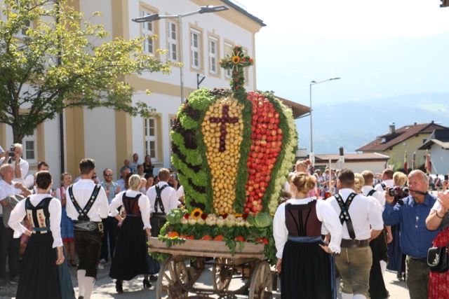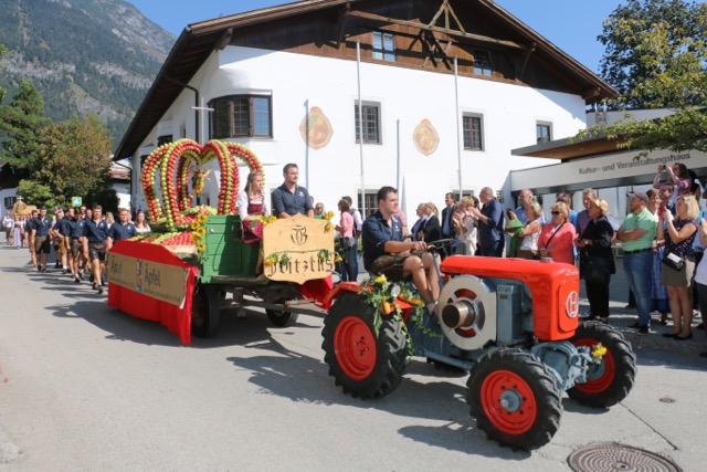 Bei wunderschönem Wetter fand am vergangenen Sonntag, dem 16. September 2018, das Bei wunderschönem Wetter fand am vergangenenBezirkserntedankfest „Des isch Hoamat" der Jungbauernschaft/Landjugend Bezirk Innsbruck Stadt/Land in Thaur statt. Oberhalb der Pfarrkirche Thaur wurde die Heilige Messe abgehalten, während dutzende Festwägen und Traktoren schon in den Startlöchern für den großen Umzug standen. Nach dem traditionellen Fahnenschwingen war es dann endlich soweit und der Erntedankumzug konnte beginnen. Insgesamt präsentierten 60 Festwägen aus dem ganzen Bezirk stolz ihre Erntegaben.