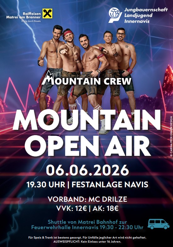 Am Samstag, den 06. Juni 2026, verwandelt sich die Festanlage Navis in eine spektakuläre OpenAir-Bühne! Freut euch auf ein echtes Highlight: Mountain Crew live on stage! Bereits ab 19:30 Uhr sorgt MC Drilze als Vorband für beste Stimmung, bevor die Mountain Crew die Bühne übernimmt und das Mountain OpenAir zum Beben bringt. - Festanlage Navis - Beginn: 19:30 Uhr - Vorverkauf: 12 € | Abendkassa: 18 € - Shuttle von Matrei Bahnhof zur Feuerwehrhalle Innernavis (19:30 – 22:30 Uhr) - Einlass ab 16 Jahren (Ausweispflicht) Für Speis und Trank ist bestens gesorgt – feiert mit uns einen unvergesslichen Sommerabend in einzigartiger OpenAir-Atmosphäre!