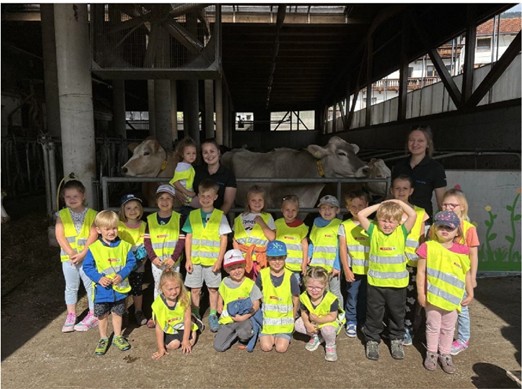 Stallführung: Hier konnten die Kinder Kühe, Hasen, Ziegen und Hühner hautnah erleben. Es wurde gestaunt, gefragt und viel über das Leben der Tiere gelernt. Weiteres lernten die Kinder, wo unsere Lebensmittel herkommen.