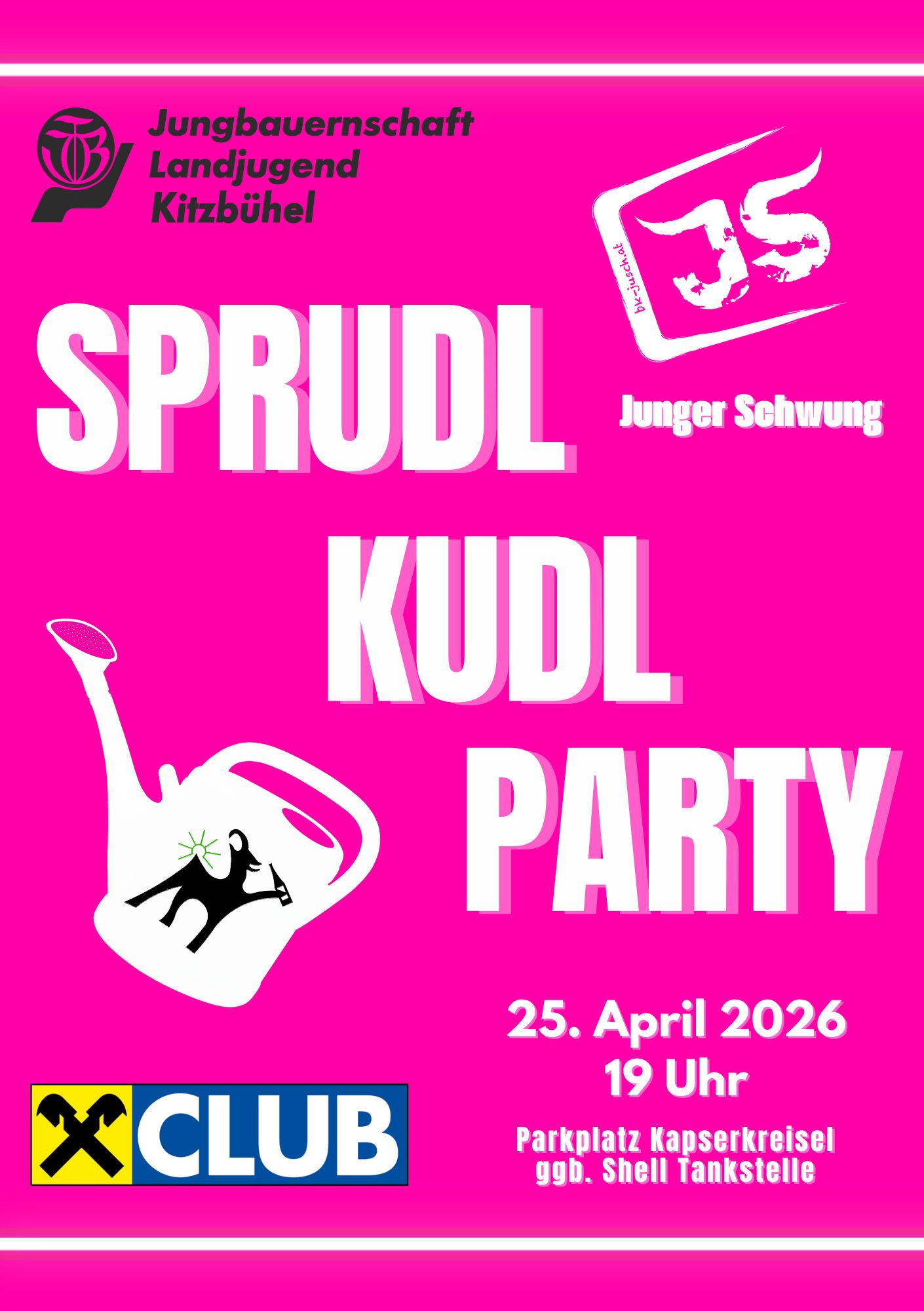 ! Save the date ! Am 25.April 2026 veranstaltet die Jungbauernschaft/Landjugend Kitzbühel die KUDL SPRUDL PARTY! Wo: Kapser Kreisl Parkplatz in Kitzbühel Wann: 25.April 2026 Beginn: 19:00 Uhr --> Mottobar An der musikalischen Unterhaltung darf es natürlich auch nicht fehlen. --> Junger Schwung Für Speis und Trank ist bestens gesorgt! Eintritt: Ab 16 Jahren, eintritt nur mit gültigen Lichtbildausweis Der Ausschuss und die gesamte Kitzbüheler Jungbauernschaft/Landjugend freuen sich auf zahlreiche Besuchern aus Nah und Fern.