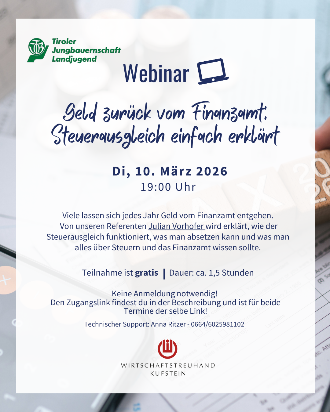 Wir laden recht herzlich zu folgendem Webinar ein: Geld zurück vom Finanzamt - Steuerausgleich einfach erklärt