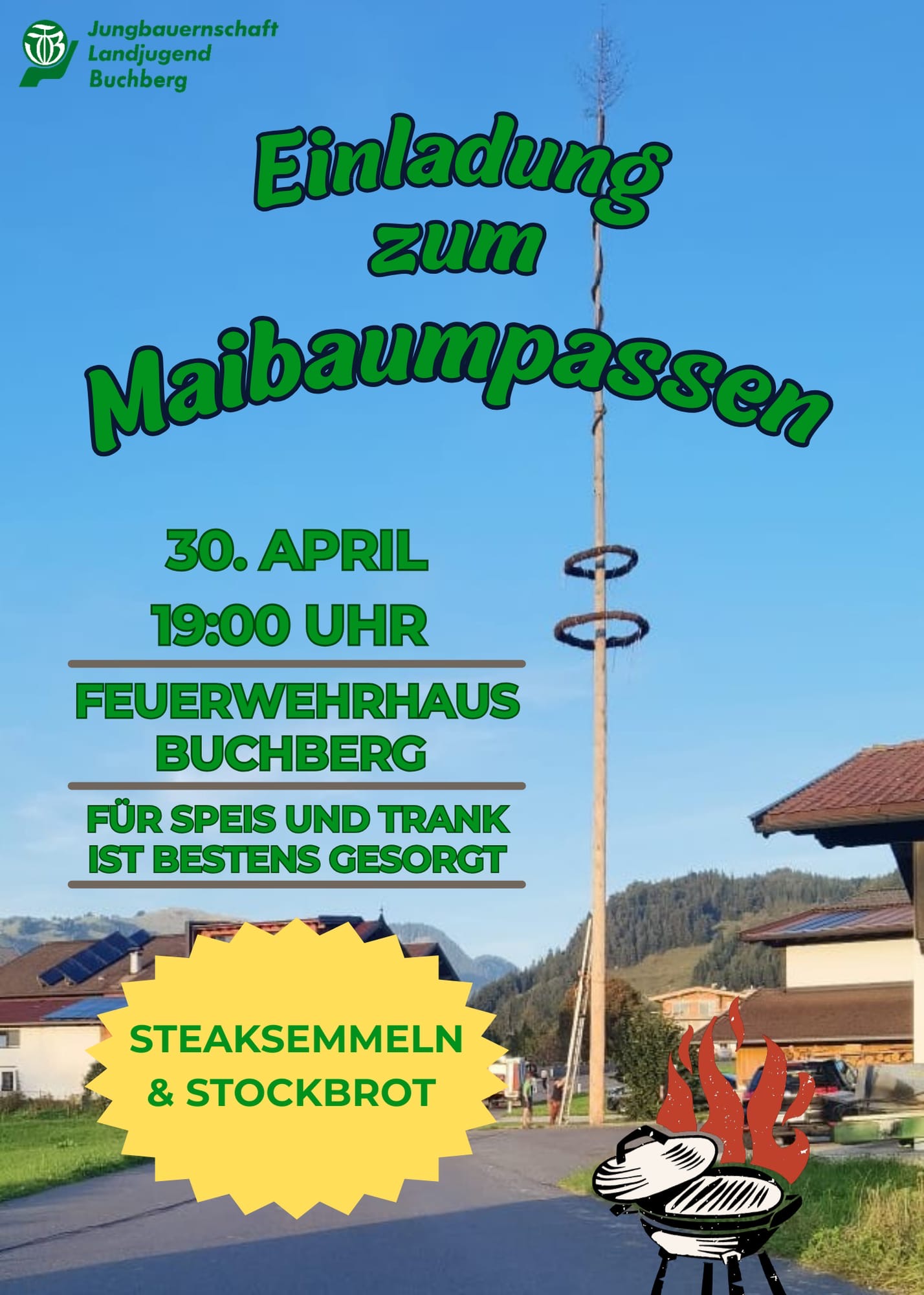 Auch dieses Jahr dürfen wir wieder recht herzlich zum diesjährigen Maibaum Passen einladen! - Los geht’s ab 19 Uhr beim Feuerwehrhaus Buchberg. - Es gibt regionale Steaksemmeln & unsere jüngsten Besucher dürfen ihr eigenes Stockbrot selber machen! Für Speis und Trank ist also bestens gesorgt! Mia gfreind ins auf a nettes gemeinsames Maibaum Passen!