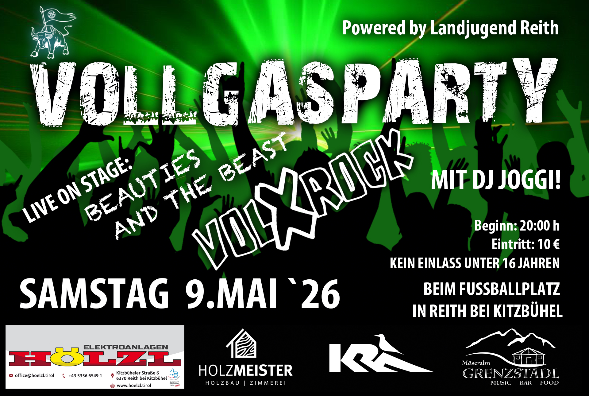 Auf gehts und dahi gehts zua Vollgssparty am 09.05.2026 ! • Beginn: 20:00 Uhr beim Fußballplatz in Reith • Musik: Volxrock, Beauties & The Beast und DJ Joggi • kein Vorverkauf • Einlass ab 16 Jahren mit Lichtbildausweis Kembs vorbei! LJ Reith bei Kitzbühel