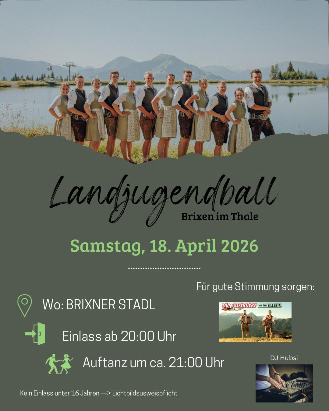 Am 18. April 2026 um 8e is wieda soweit, mia, de Londjugend Brixen sand fe insan alljährlichen Jungbauernball wieder bereit. Mit großer Freude dürfn mia enk im Brixner Stodl wieda willkommen heißen, an dean Obend versuchen mia enk, a guade Party z’schmeißn. Da DJ-Hubsi und de Ausholter aus dem Zillertal weand ins a guade Musig aufspühn, und da Ausschuss Brixen, der wead si natürlich mit‘n Auftonz aufa 9e bemühn. Mia Brixner Jungbauern weand ins de Zeit fe dean nettn Gschnochts nehma, vielleicht gfreits den Oan oda Ondan a, a boisl zkemma. Eure Landjugend/ Jungbauernschaft Brixen P.S. Kein Einlass unter 16 Jahren - Ausweiskontrolle!