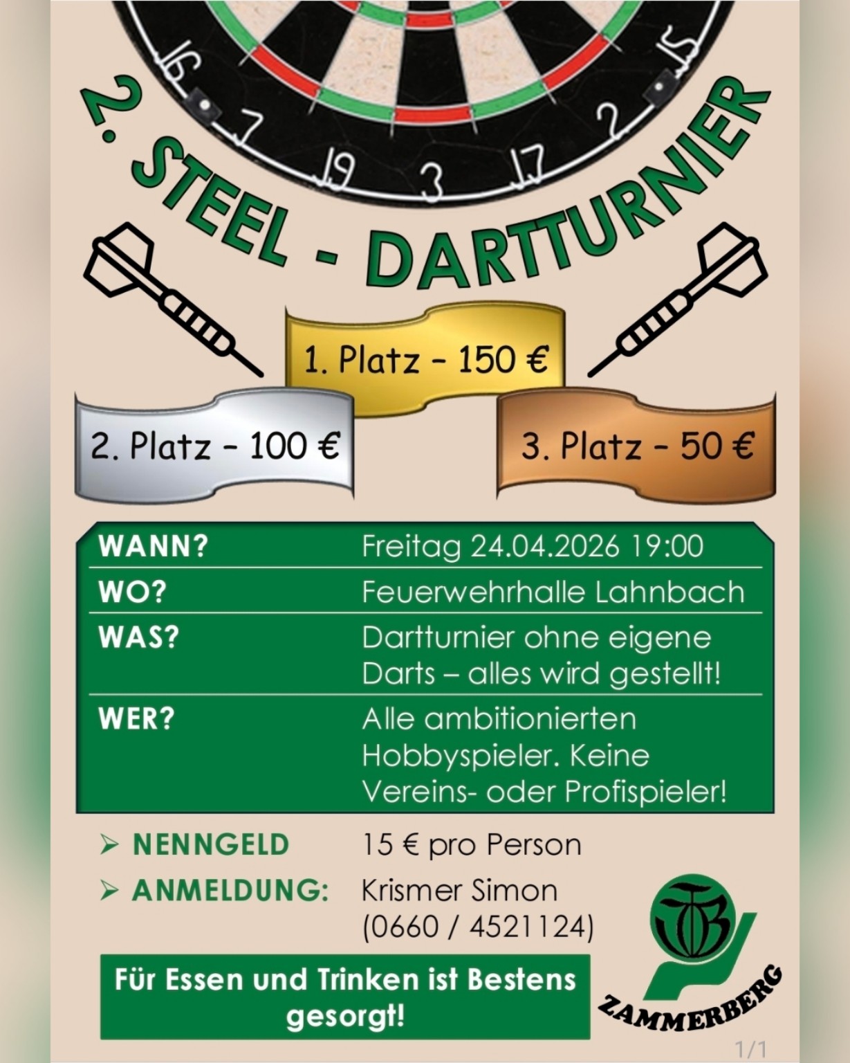 Zammerberg – Dartturnier 2. Steel-Dartturnier in Zammerberg! Freitag, 24.04.2026 | 19:00 Uhr _Feuerwehrhalle Lahnbach 1. Platz: 150 € 2. Platz: 100 € 3. Platz: 50 € ▪️ Nenngeld: 15 € ▪️ Anmeldung bei Simon Krismer (0660 / 4521124) ▪️ Darts werden gestellt Für alle Hobbyschützen – keine Vereins- oder Profispieler! Für Essen & Trinken ist bestens gesorgt!